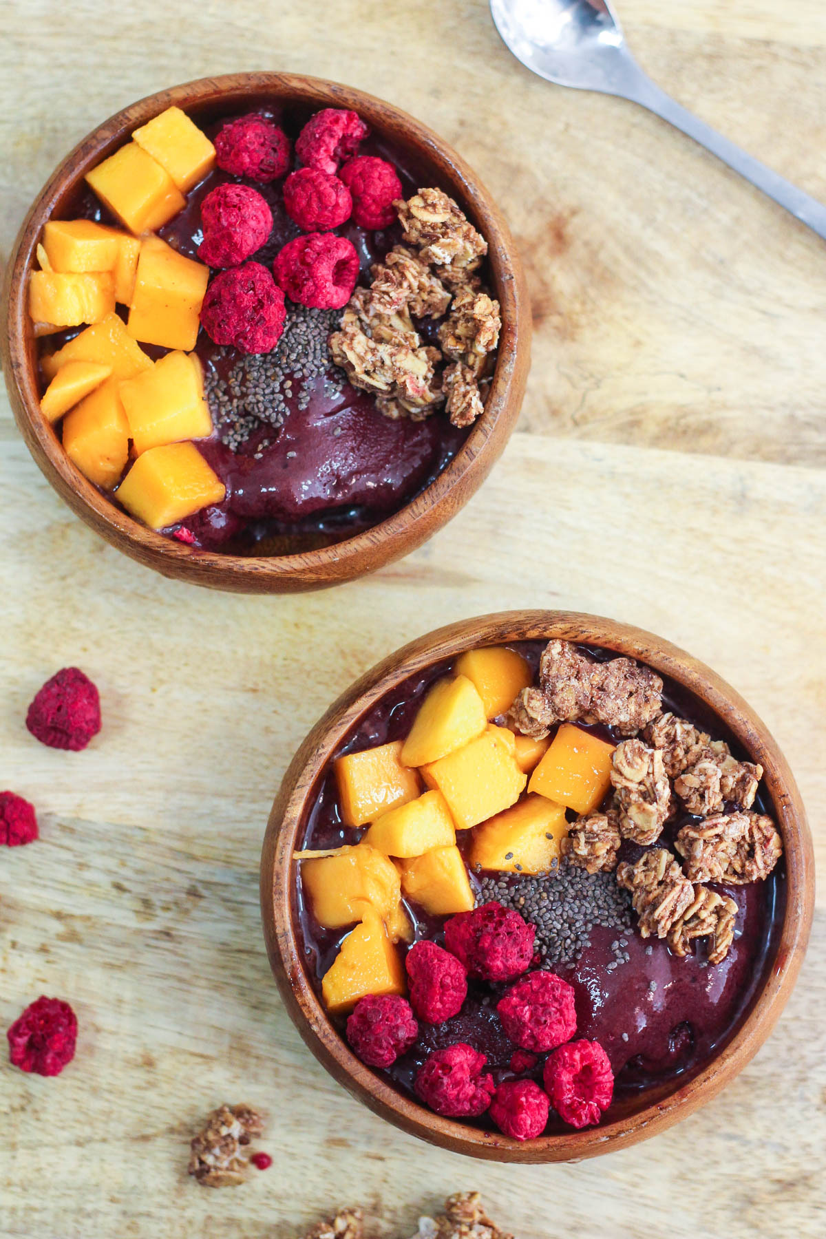 The beauty of these bowls is that you can basically make them, however the heck you want to. Use whatever you have in the freezer. Strawberries? Sure. Blueberries? Why not! Raspberries? Go for it! A mix of berries? Even better!
