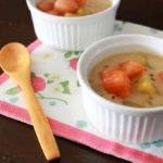 In a large pot, melt gula melaka with 1 cup of the water. If there are impurities in your syrup, strain it. Add the sweet potatoes, yam and gula melaka. Boil for 5 minutes.