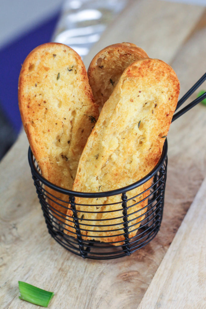 My mom is obsessed with the garlic bread prepared by me. I enjoy my garlic bread with a side of soup, you know something to dip it with? My mom, on the other hand, would easily eat them on it’s own. Ever so often, when I would purchase a loaf of baguette and cut it into really thin rounds, butter them with the garlic spread and bake them really crunchy. They turn into these really crunchy, scrumptious biscuits. Or should I say toasties? Whatever it’s called, my mom super loves it and she would store these in an airtight bottle and snack on them every day for either breakfast or tea. It keeps well in an airtight bottle for at least a week.