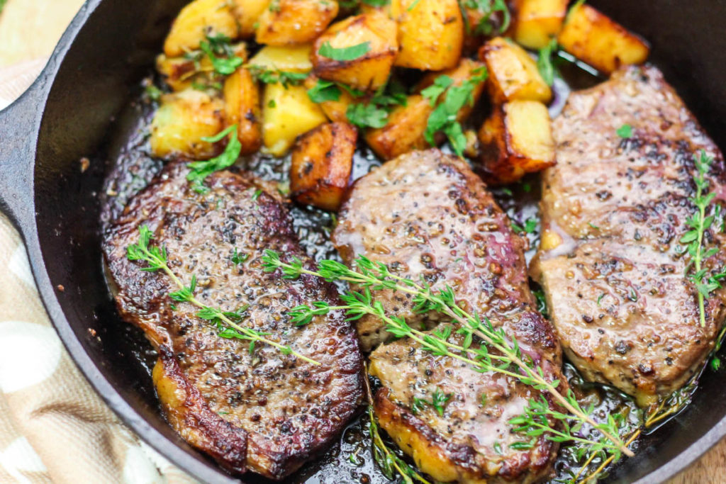- Cook through for a few more minutes and let the butter melt into both the steaks and potatoes.