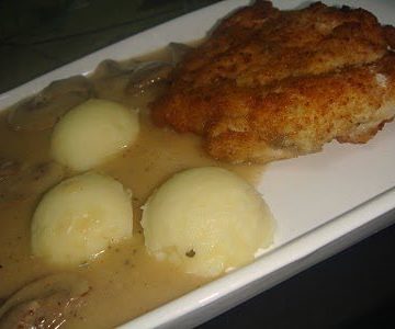 Easy Parmesan Chicken Cutlet with Mashed Potatoes in Mushroom Sauce.