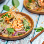 Transfer to a serving plate. Top with prawns and sprinkle with the peanuts.